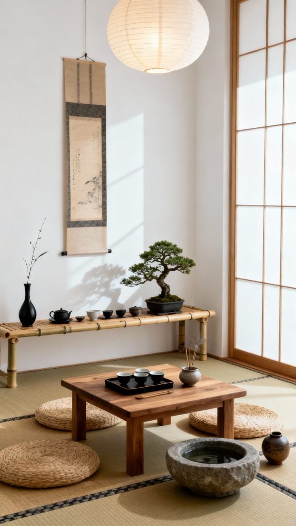 Keep furniture low: a short tea table with floor cushions, a bamboo shelf, and a bonsai as your quiet centerpiece. Add a hanging scroll, paper lantern lighting, and a stone water dish. Keep clutter minimal and meaningful.