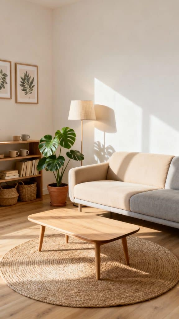 Center a simple sofa in beige or gray across a round jute rug. Pair it with a minimalist coffee table and a Monstera or Rubber Tree in a terracotta pot. Add a floor lamp with a linen shade, a wooden low bookcase, and a couple of framed botanical prints.