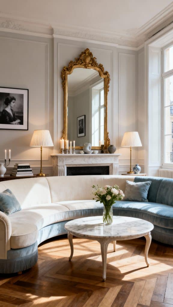 Choose a curved velvet sofa in cream or dusty blue, a marble-topped coffee table, and a gilt mirror above a pretend mantel. Add fluted lamps, fresh flowers, and black-and-white photography. Keep clutter refined and symmetrical.