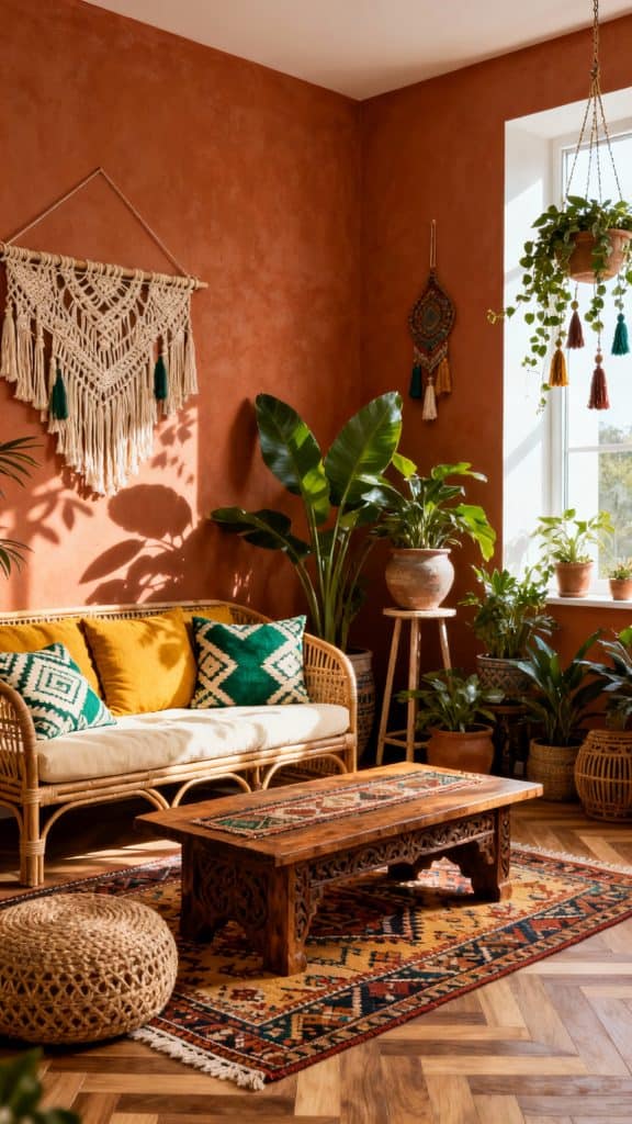 Mix a rattan sofa, macramé wall hangings, and a kilim or Moroccan rug. Scatter potted plants at different heights and add a hanging planter near the window. Use woven poufs, bright cushions, and a low carved table to center the space.