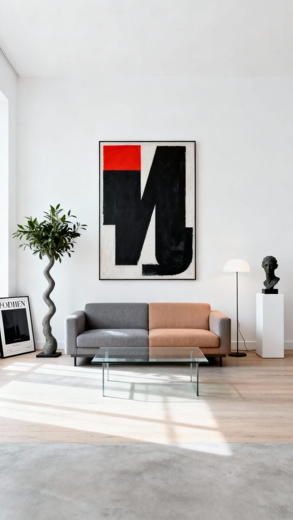 Choose a single-color sofa (think slate or sand), a glass coffee table, and one large-scale artwork above the couch. Add a tall plant for softness and a single sculptural lamp. Keep surfaces clear so every piece shines.