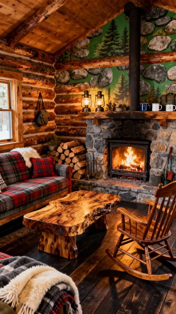 Set a plaid sofa near a wood-burning stove or fireplace, add a burl coffee table, and spread a bears or antlers motif rug. Decorate with lanterns, mounted fish, and stacked firewood. A rocking chair completes the hearth scene.