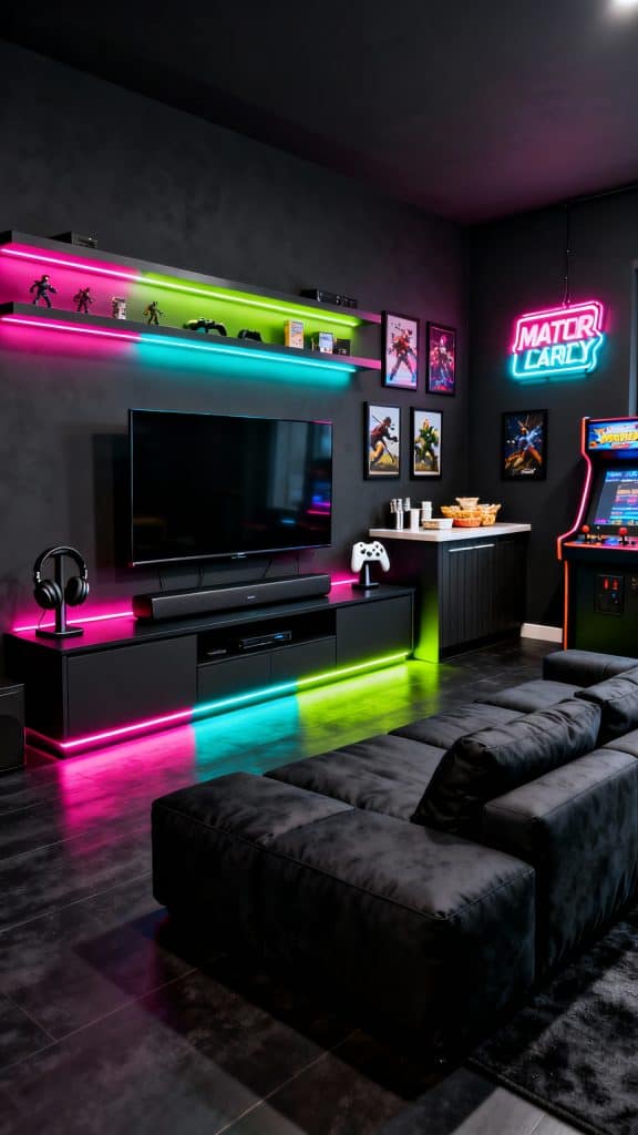 Build a low entertainment unit with a large TV, add a modular sectional, and sprinkle in RGB strip lights behind shelves and under the console. Include a compact snack bar, headphone stand, and arcade cabinet if you have the space. Neon wall signs make it insta-ready.
