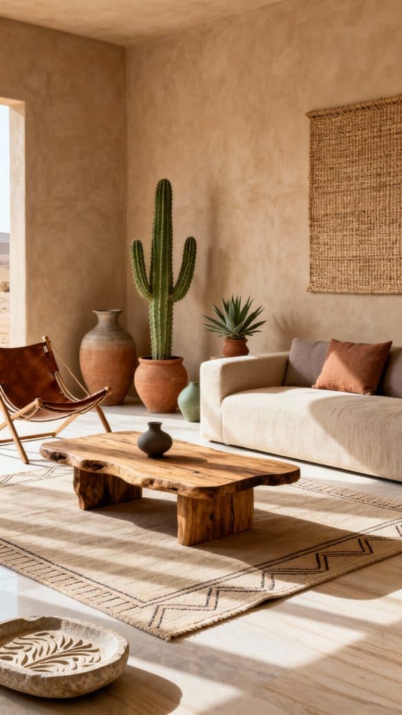 Anchor with a linen sofa in bone or taupe, a low raw-wood coffee table, and a flatwoven rug with desert geometrics. Add ceramic vessels, cactus and succulents, and a woven wall panel. Keep lines minimal but materials tactile.