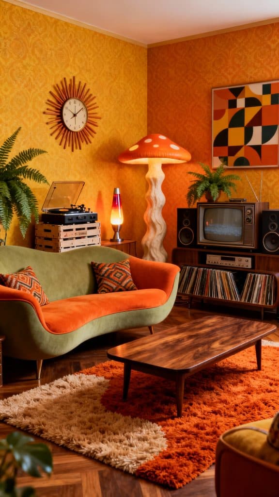 Bring in a curvy sofa in tangerine or olive, a low walnut coffee table, and a shag rug. Add record players, vinyl crates, and a retro tube TV or speaker setup. Round it out with lava lamps, sunburst clocks, and a fern or two.