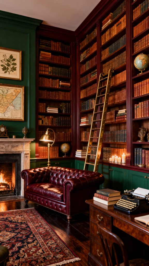 Anchor the room with a leather Chesterfield or tufted sofa, a reading lamp, and a rolling library ladder if you have one. Add stacked books, framed vintage maps, and a globe. A fireplace elevates the cozy factor tenfold.