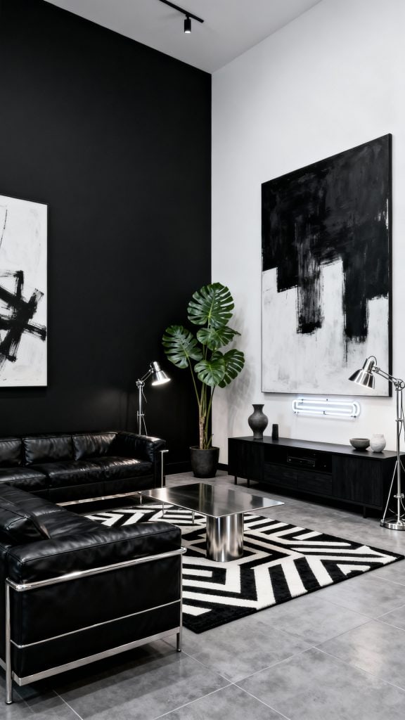 Place a black leather couch opposite a low media console. Add a geometric rug, industrial floor lamps, and a minimal metal coffee table. Finish with abstract art and a single bold plant to soften the edges.