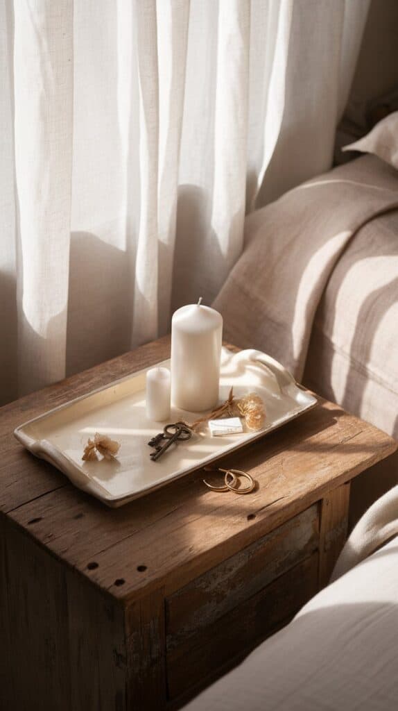 Want to make your room look cooler? Try adding a ceramic tray on your bedside table! Pick a tray that matches your room, like a simple one or a bumpy, rustic one. It looks nice and helps keep your candles and small treasures tidy.