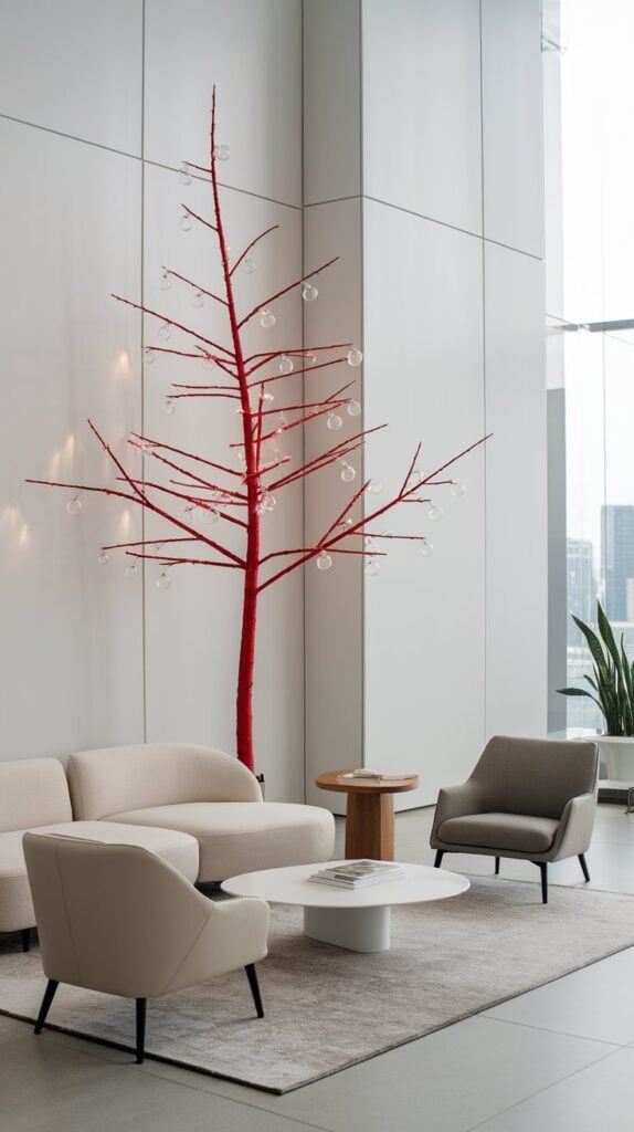 Modern Minimalist Space With A Sleek Red Tree Against White Walls And Neutral Furniture