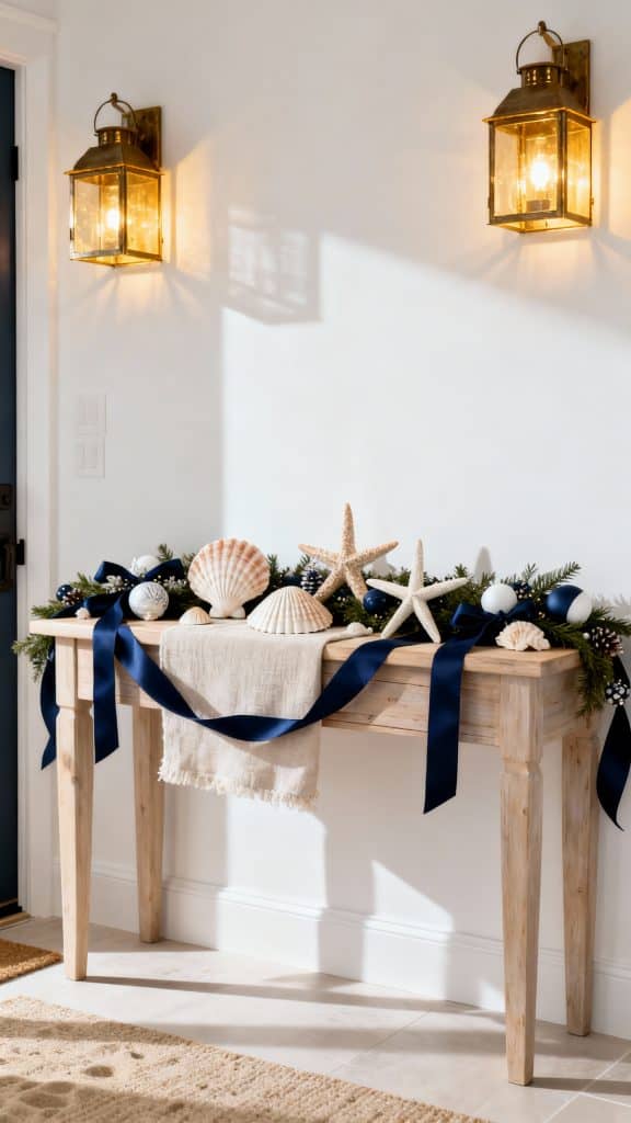 Bright Coastal Christmas Entry With A Light Wood Table, Navy Ribbon Garland, Seashell Accents, And Warm Lanterns On White Walls