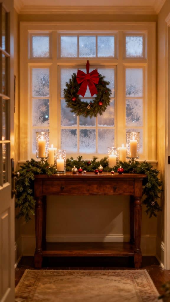 Classic Holiday Foyer With A Wooden Console Table, Evergreen Garland, Candlelight Glow, And Frosted Windows Framing A Red Bow Wreath