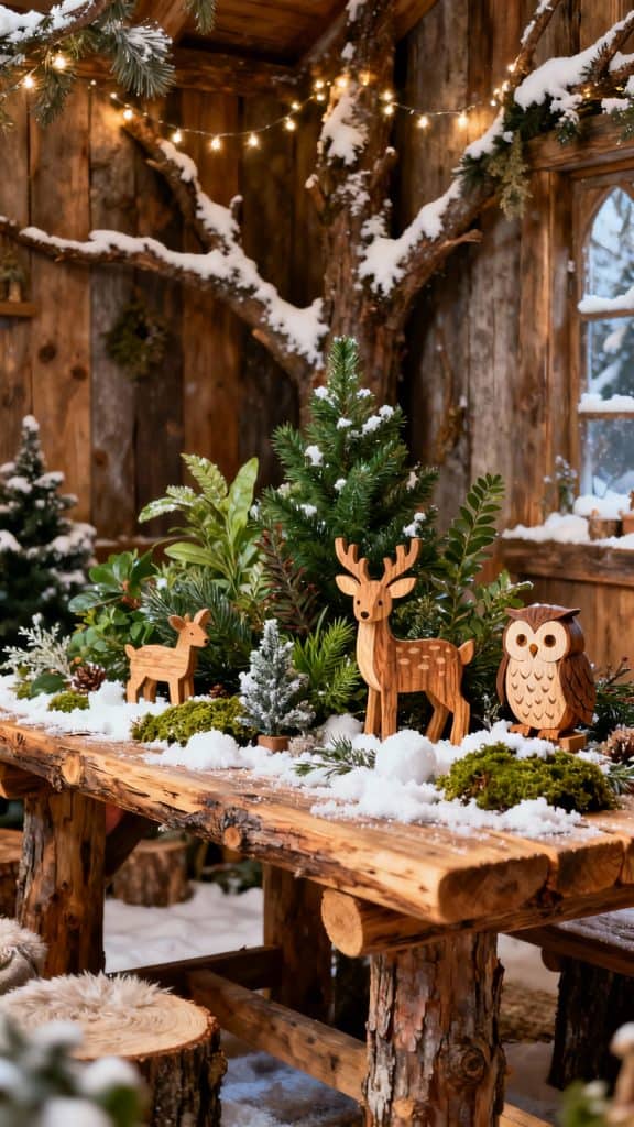 Woodland Storybook Entryway With A Pine Table, Forest Greenery, Wooden Animal Figures, And Snowy Details Against Rustic Walls