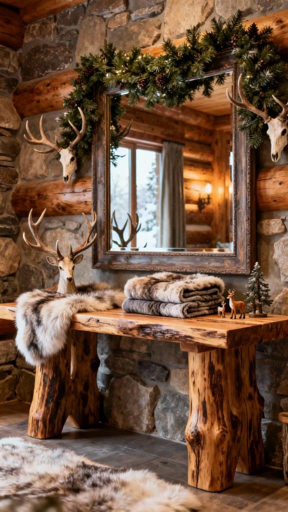Mountain Lodge Entryway With A Solid Timber Table, Faux Fur Accents, Antler Décor, And A Fir Garland Draped Over A Large Framed Mirror