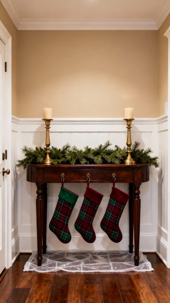 Colonial Entryway With A Rich Wood Console Table, Brass Candleholders, Evergreen Garland, And Plaid Stockings Hanging Beneath