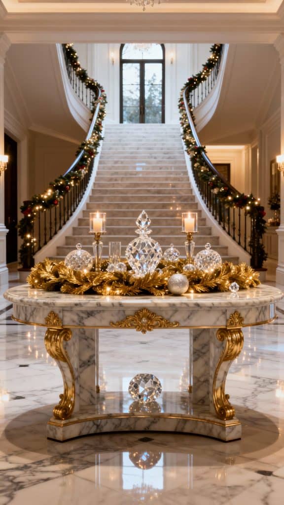 Grand Mansion Entryway With A Marble Console Table, Opulent Gold Garland, Crystal Decor, And Dramatic Double Staircase Glow