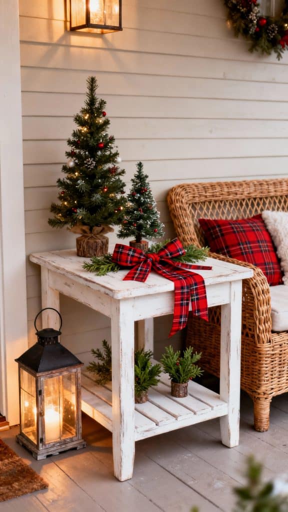 Cozy Cottage Entryway With A Whitewashed Table, Mini Christmas Trees, Plaid Accents, And Warm Lantern Lighting Beside A Wicker Bench