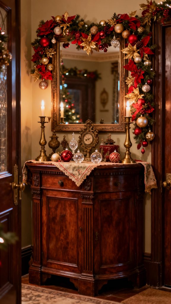 Victorian Christmas Entrance With A Mahogany Side Table, Heirloom Ornaments, Candlelight, And Lush Red-And-Gold Garland