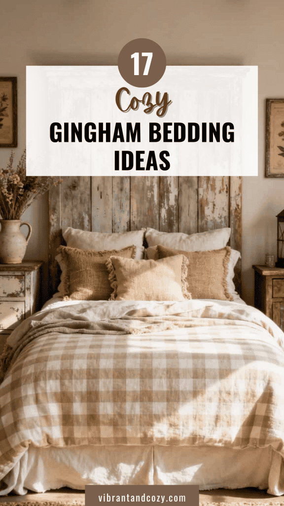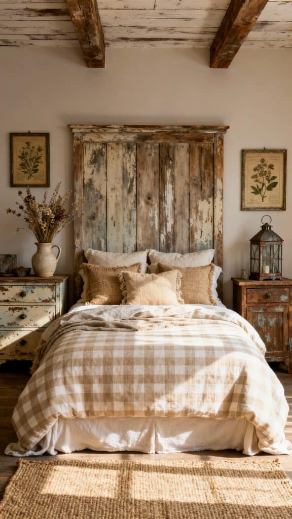 When you want to create a rustic farmhouse vibe in your bedroom, consider starting with a beige gingham duvet as a foundation. This classic pattern instantly evokes a sense of warmth and simplicity.