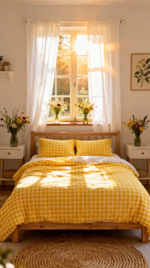 Sunny Bedroom With Yellow Gingham Bedspread And Fresh Wildflowers