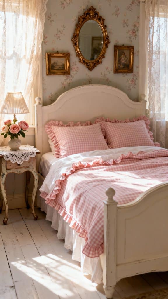 While embracing a romantic vintage vibe, pink gingham bedding transforms your room into a charming sanctuary. This delicate pattern adds a touch of nostalgia, perfect for creating a dreamy atmosphere.