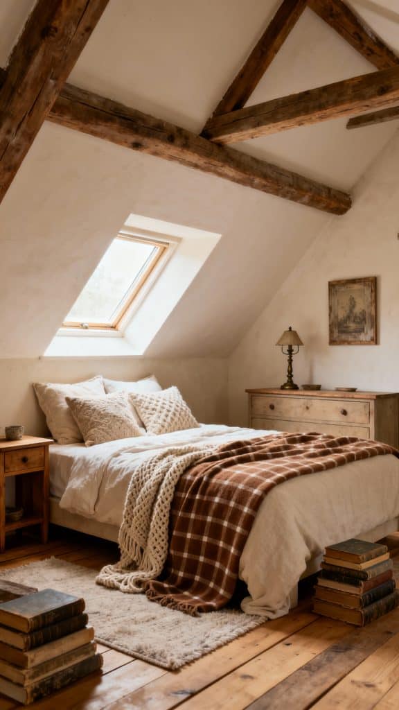 Nestle into the charm of an attic retreat with a brown gingham blanket draped over your bed, perfectly complementing the rustic allure of slanted ceiling beams. The attic decor invites warmth and coziness, ideal for curling up with a good book or enjoying a peaceful night’s sleep.