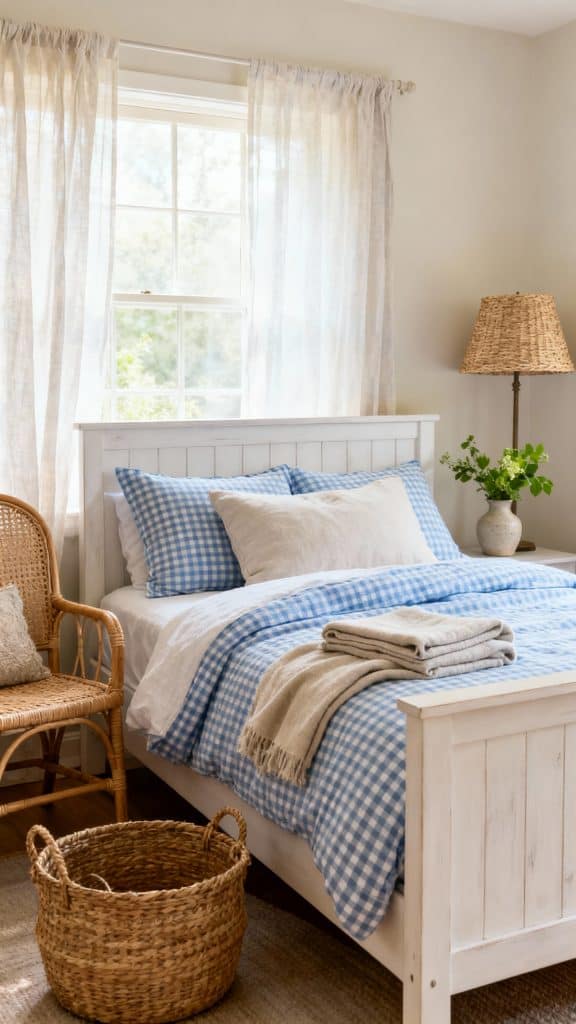 Keep the color palette subtle and cohesive, letting the blue gingham and wicker accents serve as focal points for your cottage-inspired sanctuary.