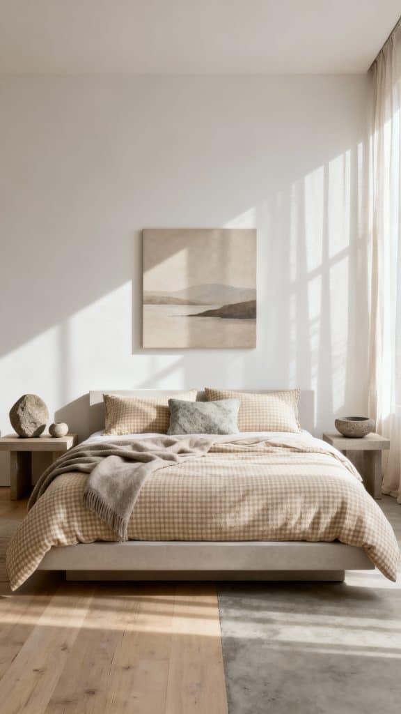 Peaceful Minimalist Space With Beige Gingham Duvet And Stone Decor