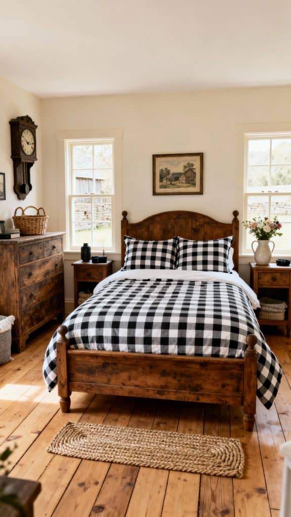 Classic Country Cottage Room With Black And White Gingham Bedding Set