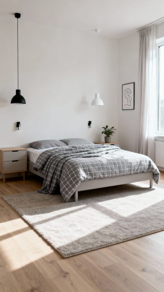 Scandi-Inspired Space With Grey Gingham Quilt And Minimalist Lighting