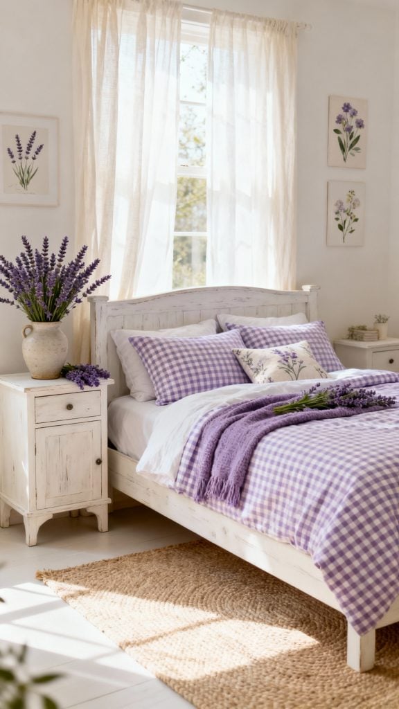 A spring-inspired bedroom becomes a serene retreat with lavender gingham bedding paired with whitewashed wood accents. As you enter, the soft lavender tones evoke a sense of calm and renewal, perfect for embracing the fresh energy of spring.
