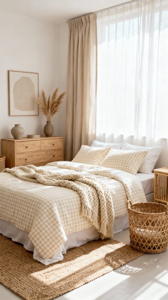 Transform your bedroom into a serene haven by incorporating cream gingham sheets and woven textures.