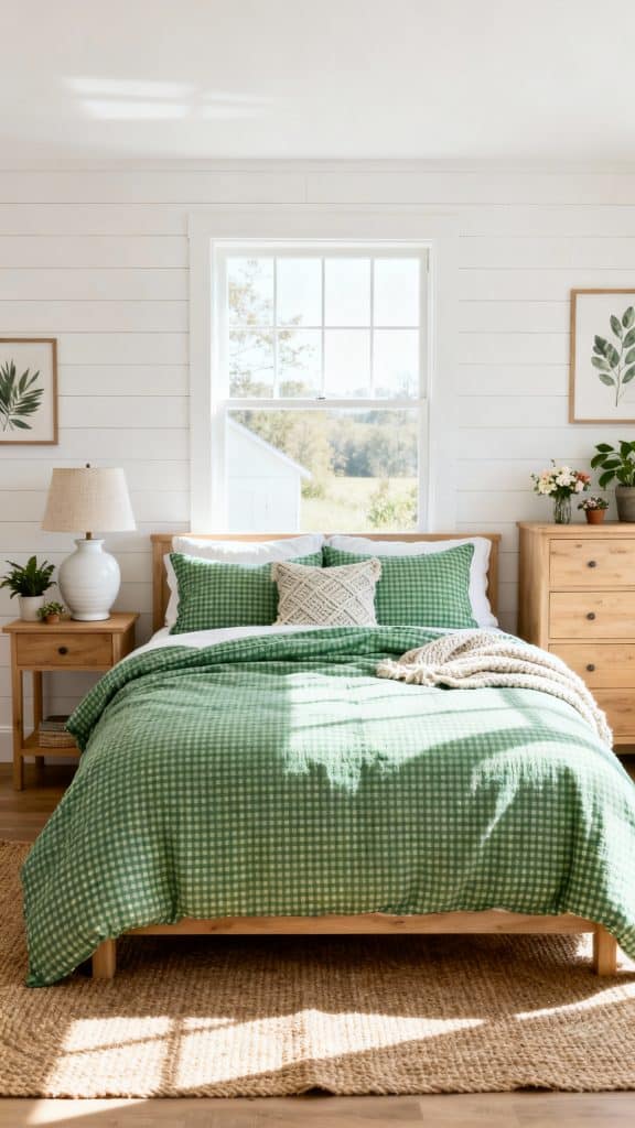 While rustic farmhouse style embraces warmth with its beige gingham patterns, you can achieve a fresh look with a modern country bedroom using a green gingham comforter paired with white shiplap walls.