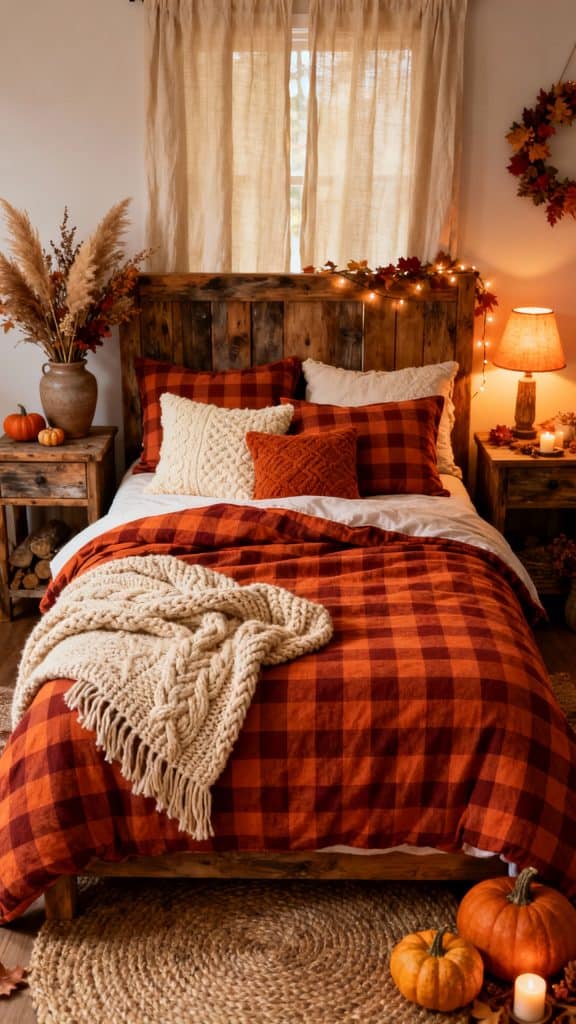 Warm Autumn-Themed Room With Burnt Orange Gingham Bedding And Knit Throws