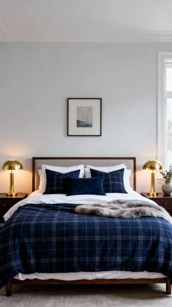 Although often overlooked, combining navy gingham bedding with brass lamp fixtures can instantly elevate your bedroom’s elegance. The rich navy accents provide a sophisticated touch, allowing you to create a serene and inviting atmosphere.