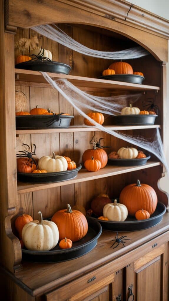 Farmhouse Hutch Decorated With Tiered Trays, Pumpkin Spice Jars, And Spiderweb Accents