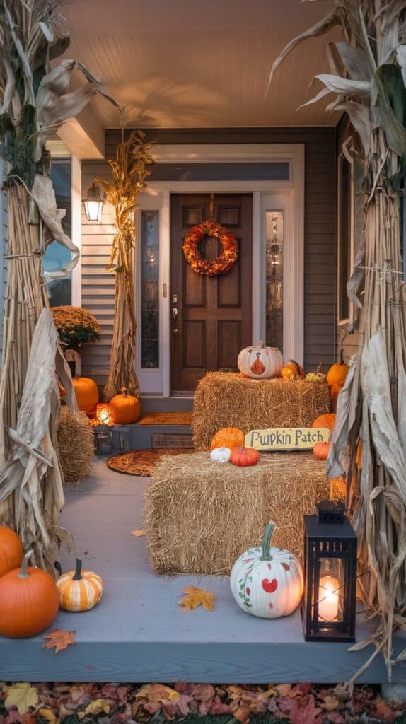 Front Porch With Cornstalks, Hay Bales, And A Hand-Painted Pumpkin Patch Sign
