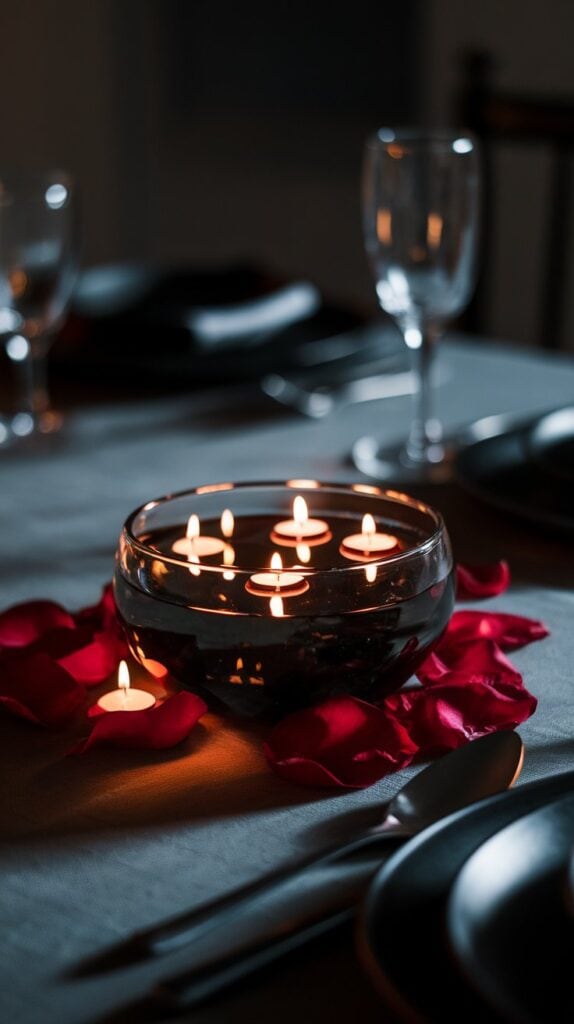 Dark Romantic Table With A Low Bowl Of Black Water, Floating Candles, And Petals