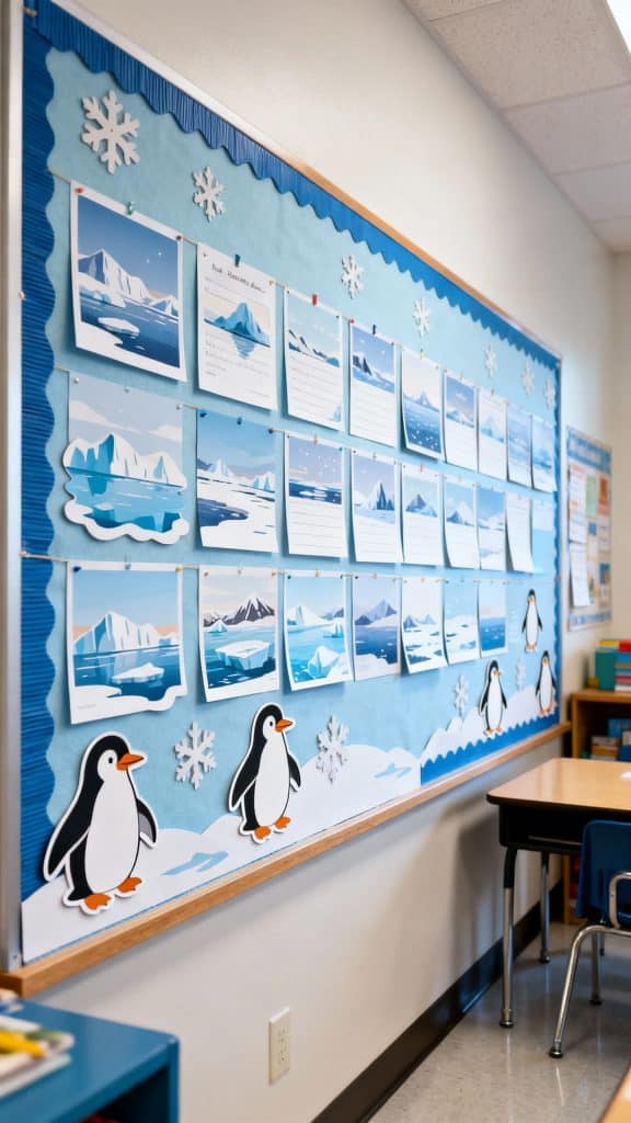 Arctic-Themed Learning Area With Cool Blues, Penguins, And Peaceful Winter Scenes