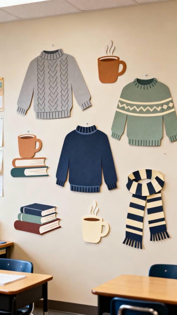 Cozy Winter Classroom Wall With Sweaters, Mugs, And Soft Neutral Tones
