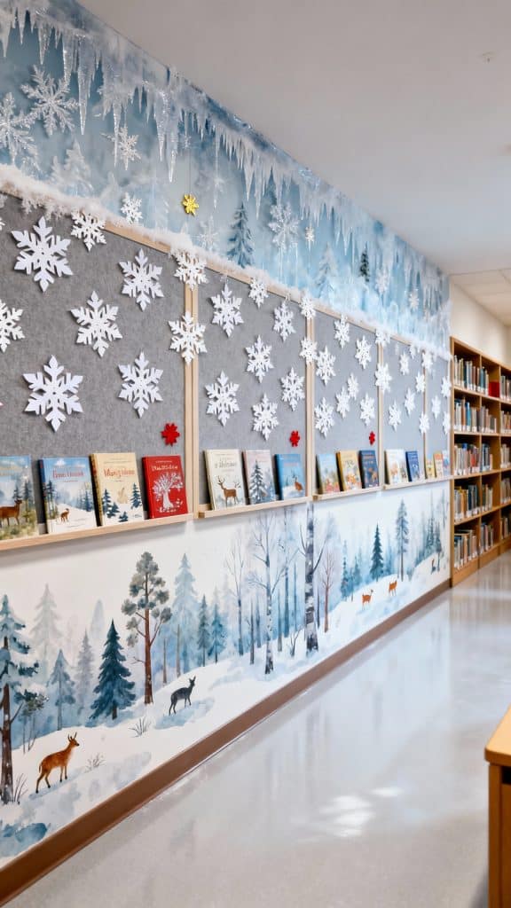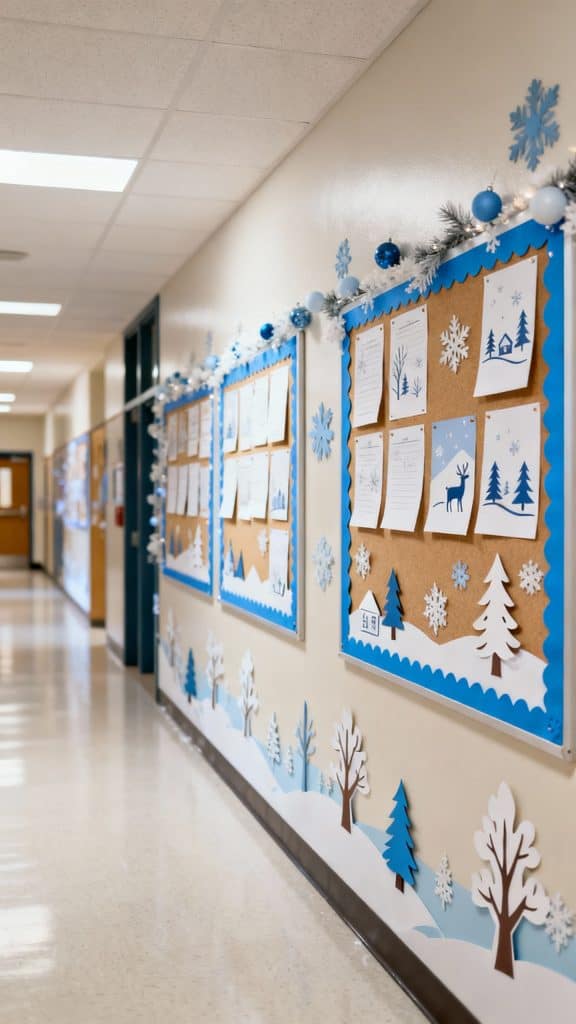 Snowy Winter Hallway With Happy Bulletin Boards And Soft Blue Decorations