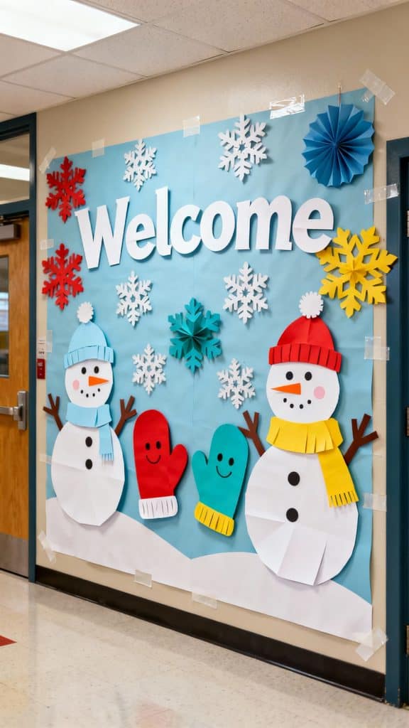 Bright Winter Welcome Wall In The School Entrance With Happy Colors And Snowy Designs