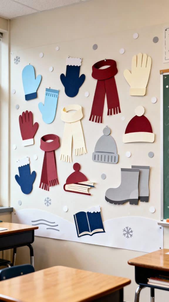Winter Classroom Wall With Mittens, Scarves, And Soft Cool Colors