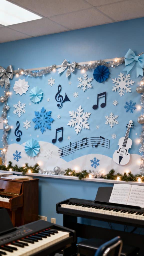 The winter wall in the music room looks really nice! People like it because the peaceful blues and cute snowflakes make the space feel calm and cozy.