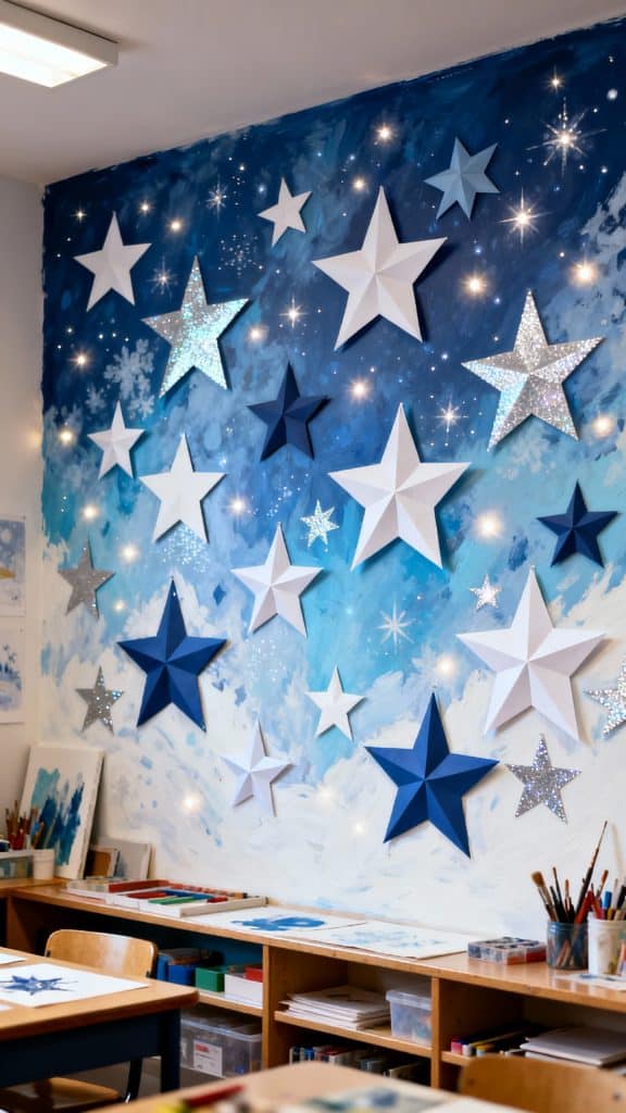 The sparkling winter stars mural makes the art room feel like a magical place. People love it because it inspires creativity and makes them feel happy.