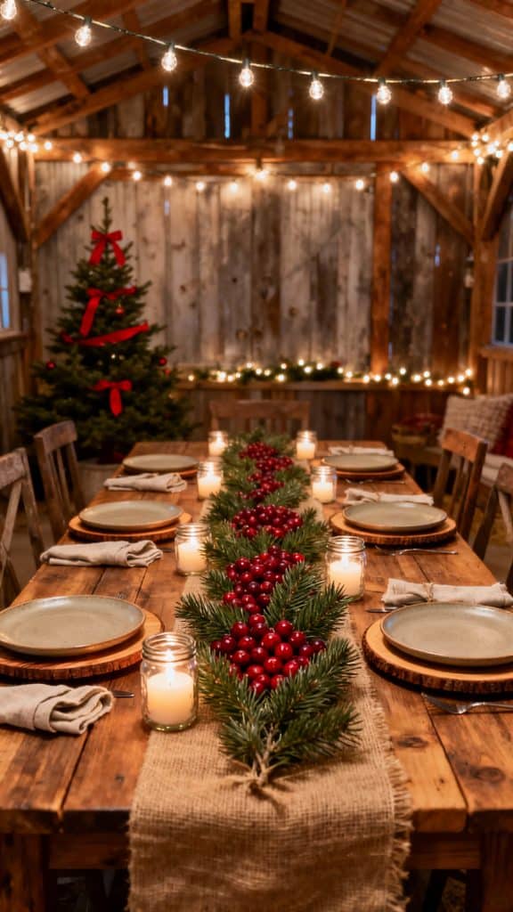 Rustic barn holiday celebration with a burlap-wrapped centerpiece of pine and cranberries on a long harvest table beneath string lights