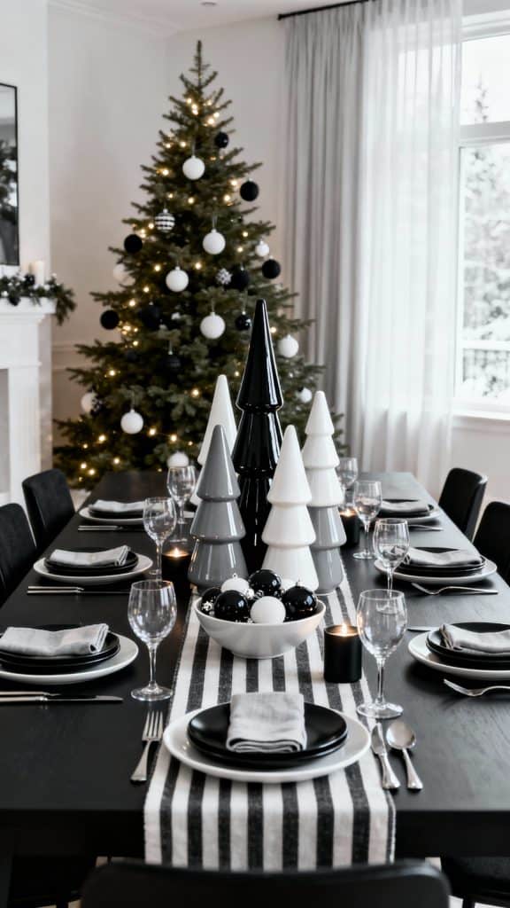 Modern black and white Christmas setting with a chic monochrome centerpiece of ceramic trees and clean winter styling throughout the space