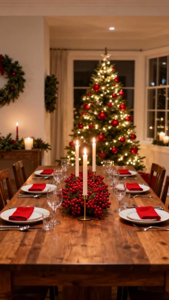 Traditional Christmas family room with a centerpiece of red berries and taper candles set on a festive table beside a glowing Christmas tree