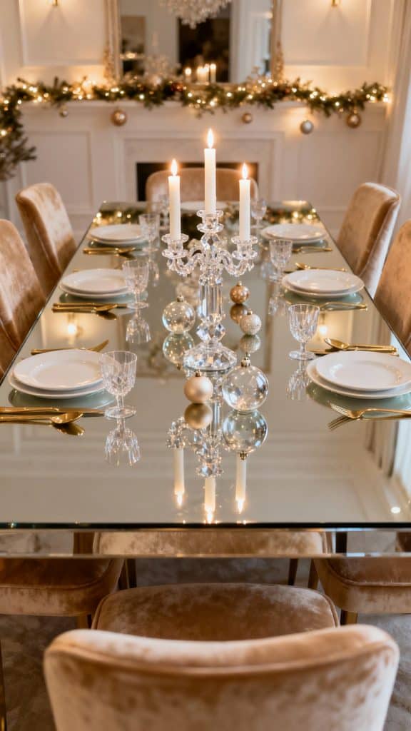Glam holiday dinner setup with a crystal-accented centerpiece on a mirrored table surrounded by velvet chairs and champagne-gold décor
