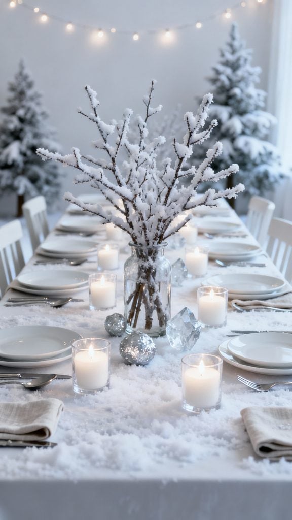 Winter wonderland banquet room featuring a centerpiece of flocked branches, icy silver accents, and snowy candle glow across the space