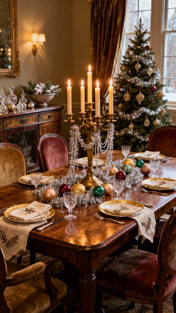 Vintage holiday dining room featuring an antique candelabra centerpiece paired with tinsel, glass ornaments, and heirloom-inspired touches